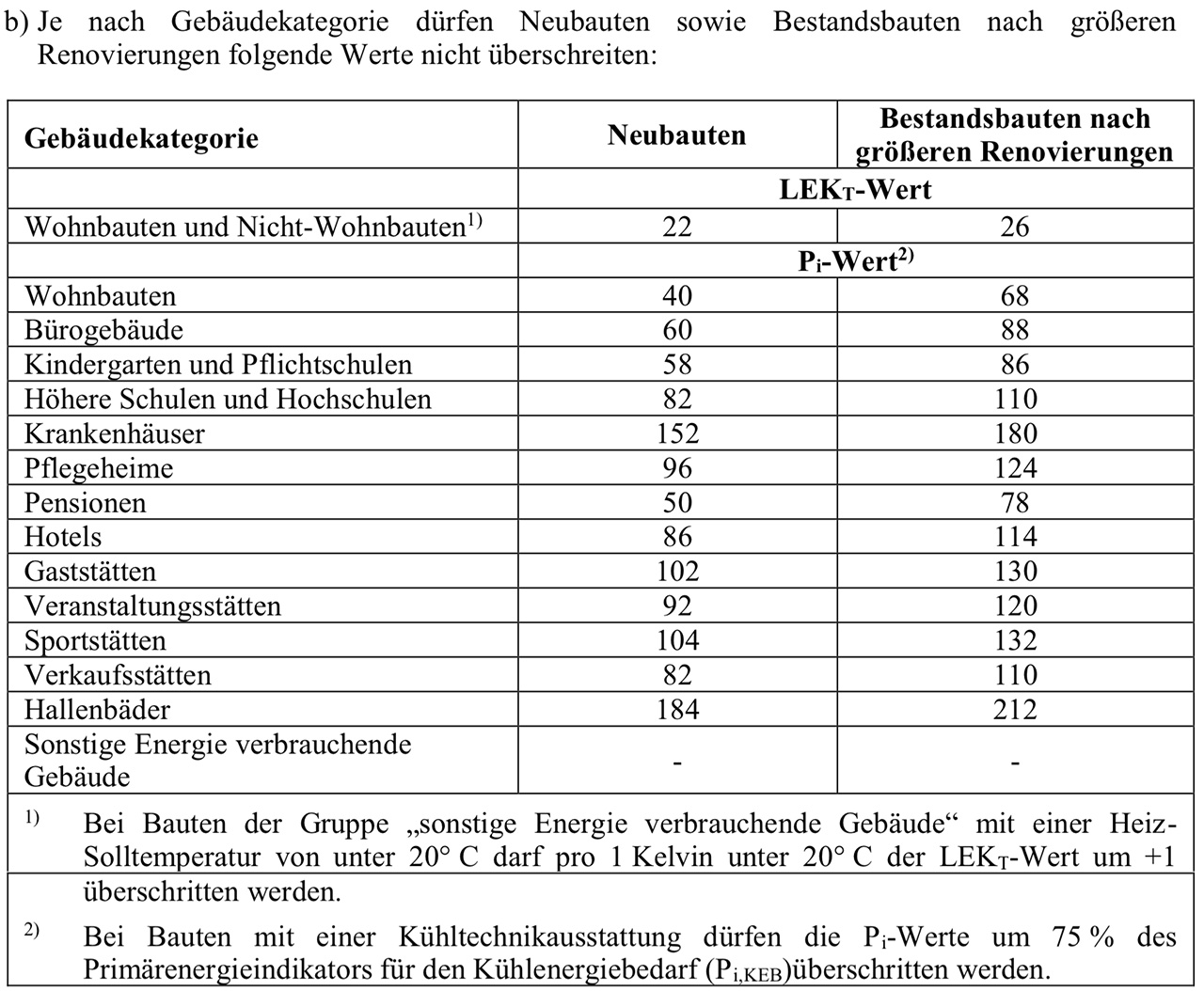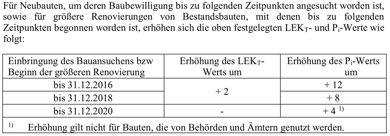 b)Je nach Gebäudekategorie dürfen Neubauten sowie Bestandsbauten nach größeren Renovierungen folgende Werte nicht überschreiten: Tabelle 1 Für Neubauten, um deren Baubewilligung bis zu folgenden Zeitpunkten angesucht worden ist, sowie für größere Renovierungen von Bestandsbauten, mit denen bis zu folgenden Zeitpunkten begonnen worden ist, erhöhen sich die oben festgelegten LEKT- und Pi-Werte wie folgt: Tabelle 2