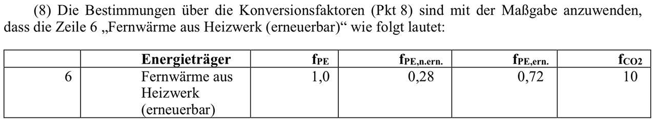 (8) Die Bestimmungen über die Konversionsfaktoren (Pkt 8) sind mit der Maßgabe anzuwenden, dass die Zeile 6 „Fernwärme aus Heizwerk (erneuerbar)“ wie folgt lautet: Tabelle 3